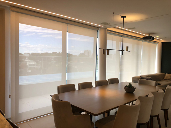 • Persiana rolo tela solar: o tecido é feito de uma tela furadinha, que permite a passagem de luminosidade e visibilidade para a área externa, mas bloqueia boa parte dos raios nocivos UV, garantindo proteção solar e térmica.